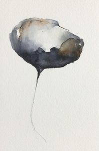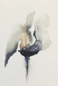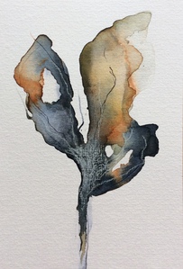 Abstracte vormen in aquarel die ontstaan uit mijn fantasie. Door de verf te laten vloeien ontstaan vormen. Deze vormen vragen om een tegenvorm waarbij ook de kleur een grote rol speelt.